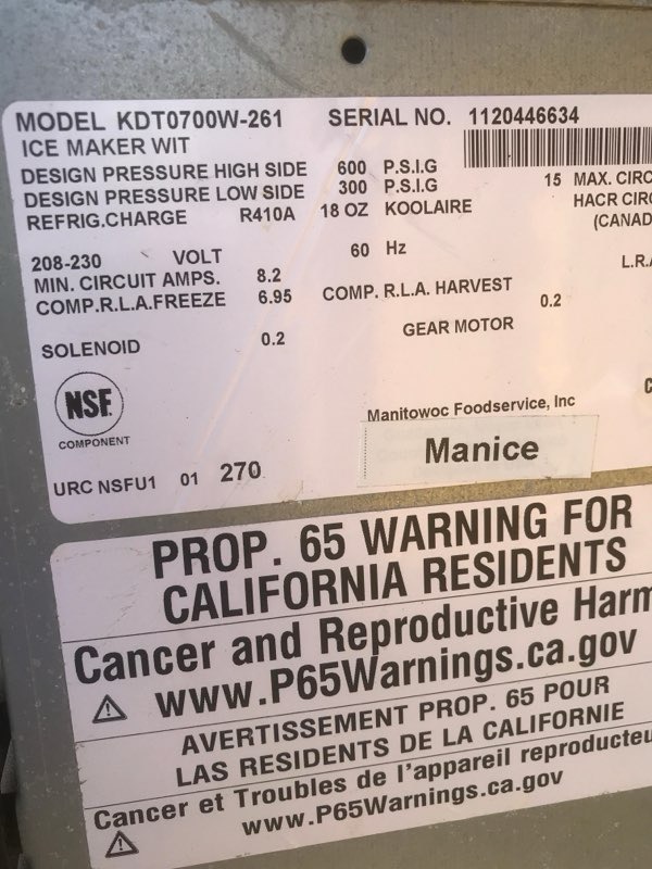 Manitowoc Koolaire KDT0700W-261 Commercial Ice Maker Key Features: - Trusted Manitowoc Foodservice quality - Model KDT0700W-261 - Water-cooled ice maker unit - Voltage: 208-230V, 8.2 Amps - Compact yet reliable for high-demand ice production Condition: This unit is in good condition with minor wear, as inspected by a technician. No major cosmetic or functional issues were noted during assessment. Ideal Use Cases: - Restaurants, cafes, bars, or event venues needing dependable ice production - Suitable for businesses requiring medium to high daily ice output - Perfect for replacing an older ice maker or expanding your production capacity Pickup Information: The unit is located at Warehouse A and available for immediate pickup. Buyer is responsible for transport. Please ensure proper voltage connections are available at your location. Contact: Serious inquiries welcome. Message for additional details or to arrange a viewing and pickup.