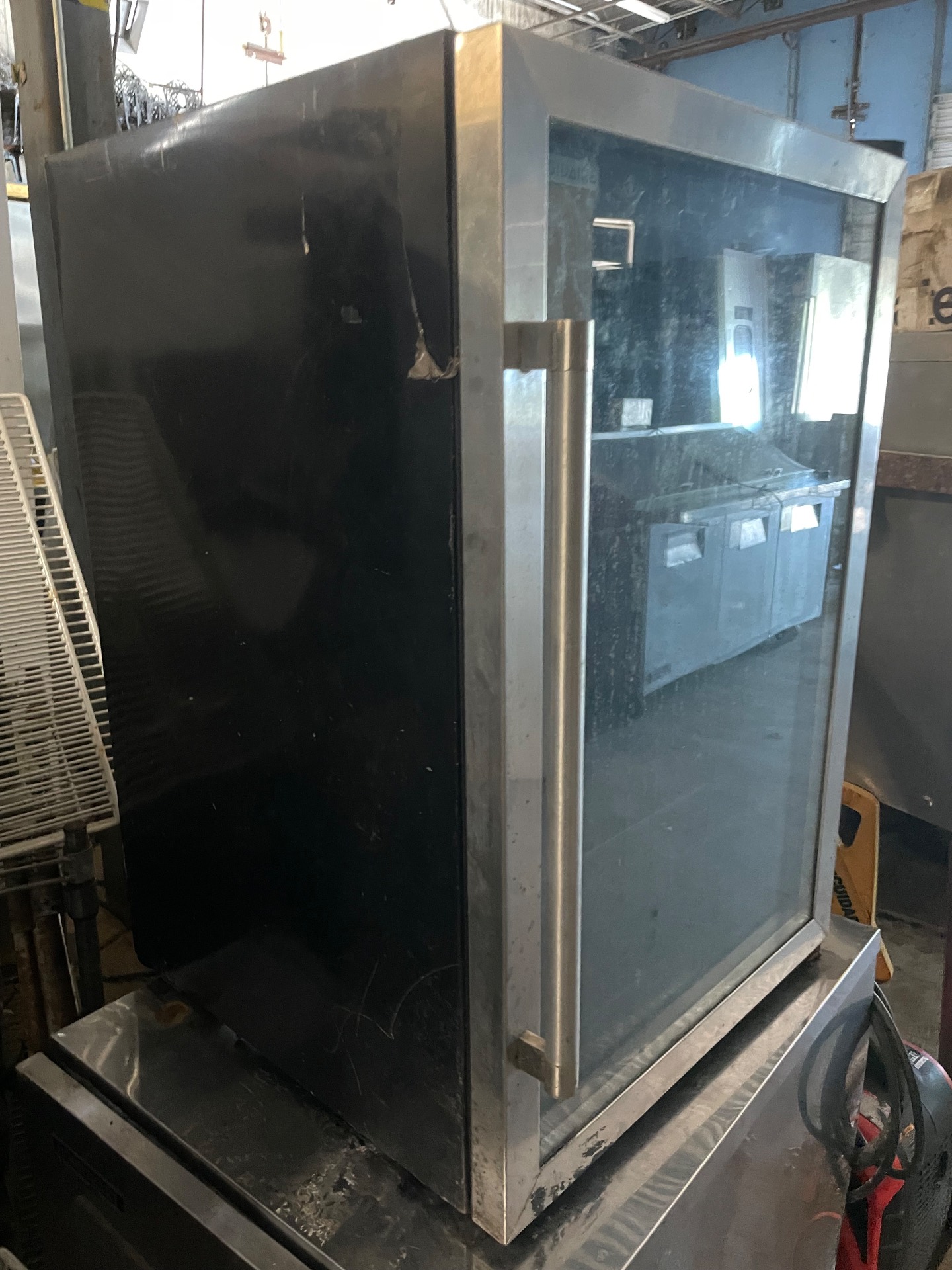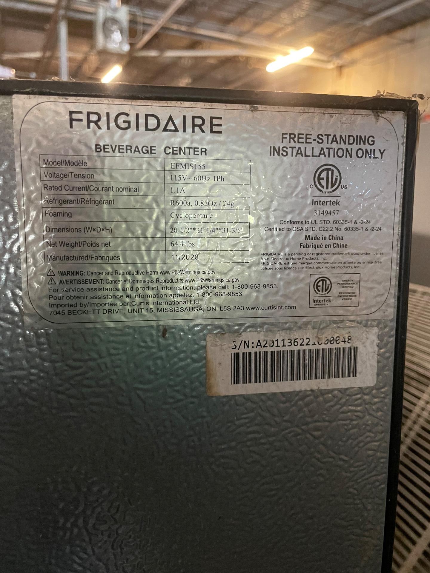 1. Equipment Name Frigidaire freestanding glass-door beverage refrigerator — Model EFMIS155 (Serial A2U113622100048). 2. Key Features - Manufacturer: Frigidaire - Model: EFMIS155 - Freestanding glass door for merchandizing bottled and canned beverages - Electrical: 115V, 1 phase, 1.1A - Technician notes: shows minor surface wear consistent with normal commercial use 3. Condition Good — Minor wear on exterior surfaces and door trim. Unit is functional per technician inspection; no major damage observed. 4. Ideal Use Cases Well suited for convenience stores, office or employee break rooms, small cafés, pop-up venues, concession stands, or any operation needing a compact merchandiser for bottled and canned drinks. 5. Pickup Information Available for pickup at Warehouse A. Local pickup only. Buyer responsible for removal and transport; bring appropriate vehicle and assistance for safe loading. 6. Contact Call-To-Action Serious inquiries welcome. Message for details, to schedule a viewing, or to request additional photos. Available for pickup — message for details.